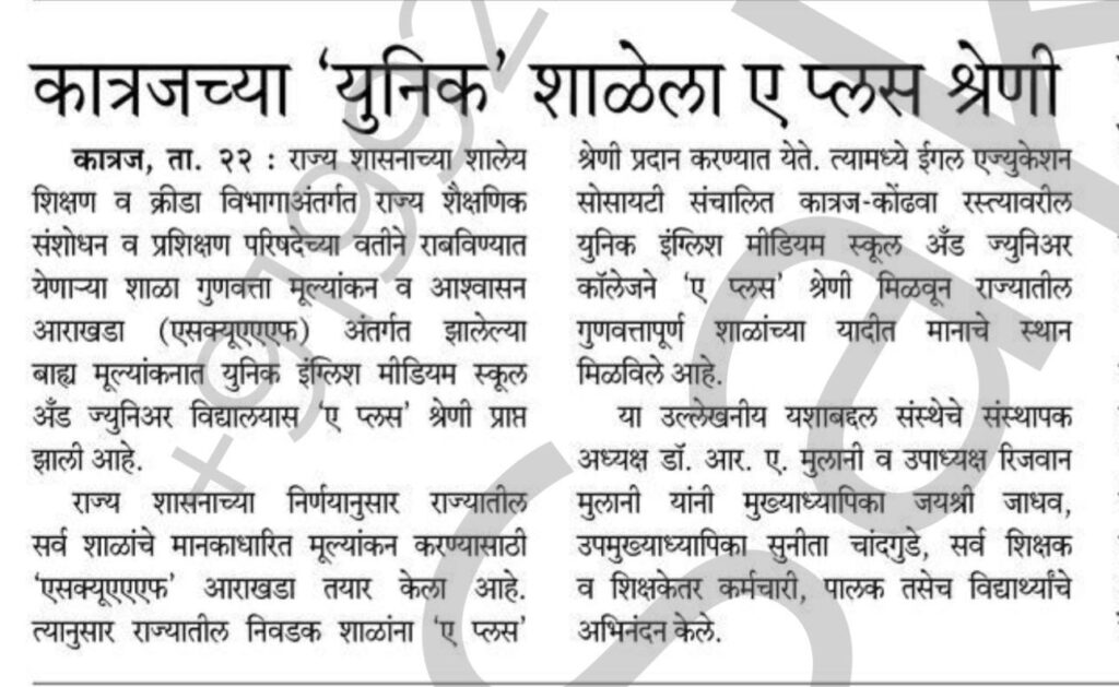 कात्रजच्या ‘युनिक’ शाळेला ए प्लस श्रेणी Post author:Admin Post published:March 4, 2026 Post category:Press & Media You Might Also Like डॉ . आर . ए . मुलाणी यांचा गौरव March 4, 2026 https://youtu.be/yieWQS3cL1k February 12, 2023 किक बॉक्सिंग स्पर्धेत केतन शर्माला सुवर्णपदक March 4, 2026